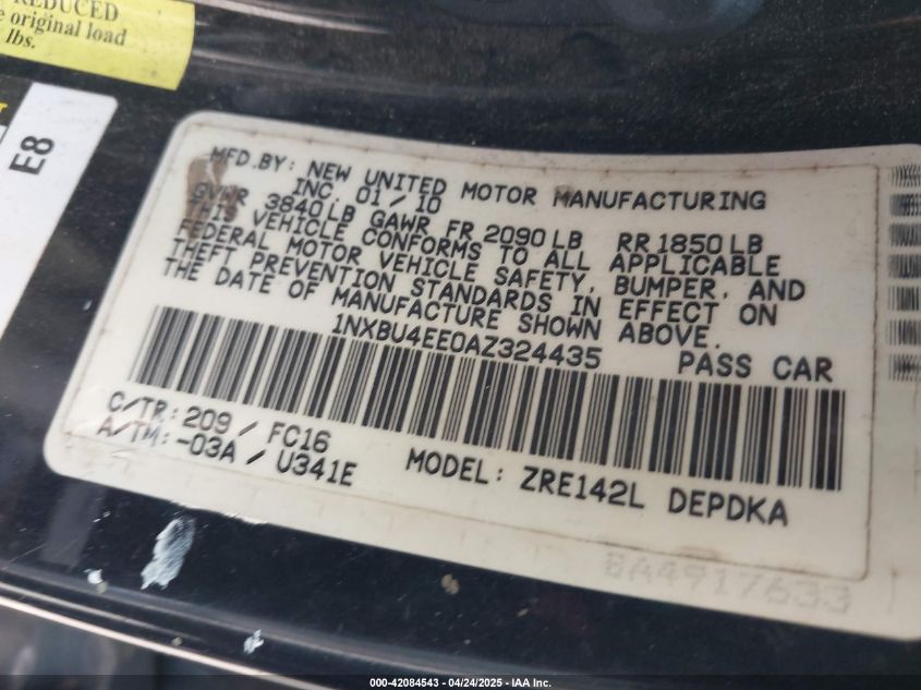 Колір ЧорнийЦиліндри 4Привід Передній привідVIN 1NXBU4EE0AZ324435Стан Заводиться та їде (перевірено)Ушкодження Звичайний знос