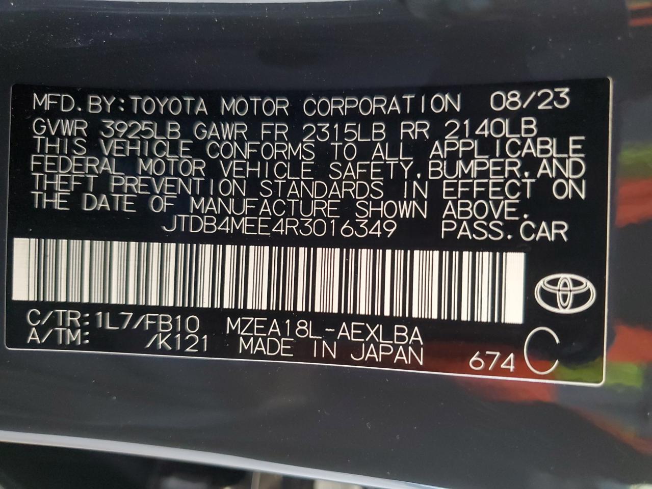2024 TOYOTA COROLLA - JTDB4MEE4R3016349, колір - Деревне вугілля, 2.0, Бензин, із США