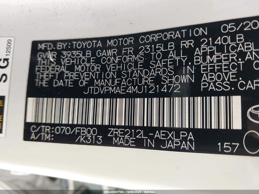 Колір БілийЦиліндри 4Привід Передній привідVIN JTDVPMAE4MJ121472Стан Заводиться та їде (перевірено)Ушкодження Ліва сторона