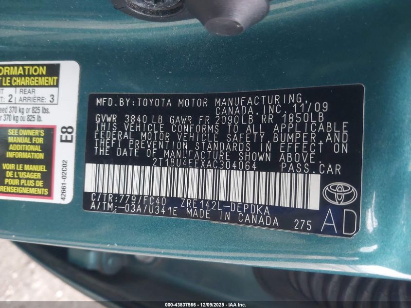 Колір БірюзовийЦиліндри 4Привід Передній привідVIN 2T1BU4EEXAC304064Стан Заводиться та їде (перевірено)Ушкодження Передня або задня