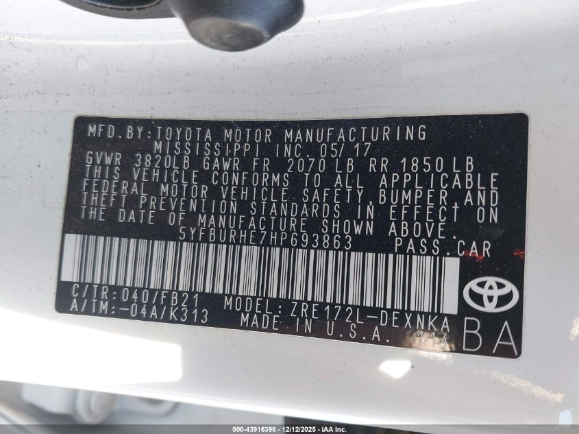 2017 TOYOTA COROLLA - 5YFBURHE7HP693863, колір - Білий, 1.8, Бензин, Передній привід із США