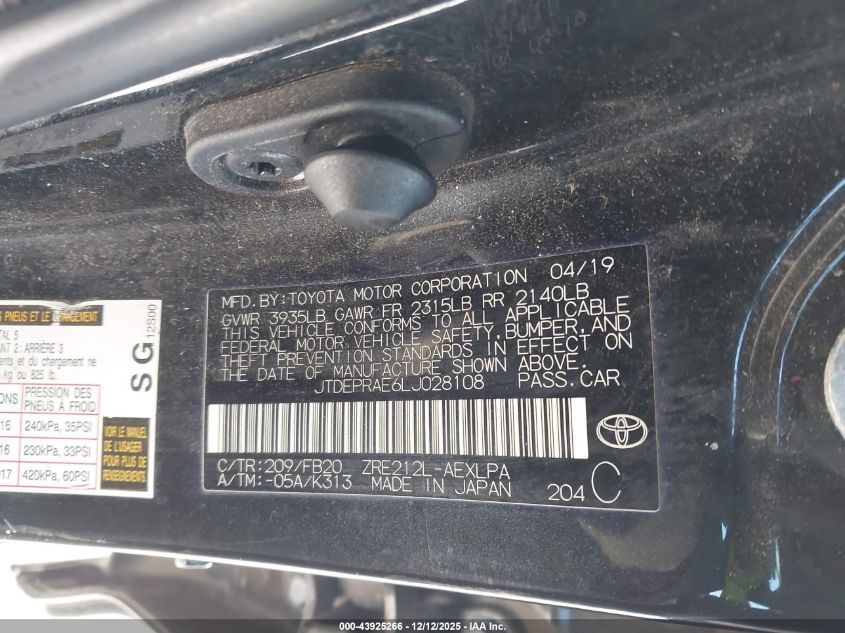 2020 TOYOTA COROLLA - JTDEPRAE6LJ028108, колір - Чорний, 1.8, Бензин, Передній привід із США
