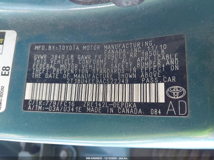 2010 TOYOTA COROLLA - 2T1BU4EE9AC522349, колір - Зелений, 1.8, Бензин, Передній привід із США