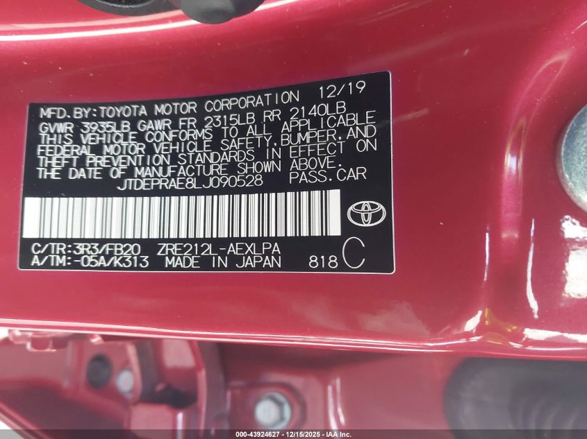 2020 TOYOTA COROLLA - JTDEPRAE8LJ090528, колір - Червоний, 1.8, Бензин, Передній привід із США