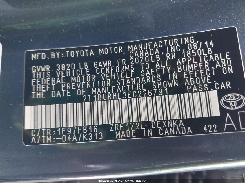 2014 TOYOTA COROLLA - 2T1BURHE3EC226791, колір - Чорний, 1.8, Бензин, Передній привід із США
