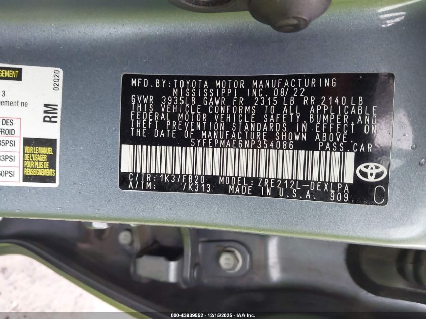 2022 TOYOTA COROLLA - 5YFEPMAE6NP354086, колір - Синій, 1.8, Бензин, Передній привід із США