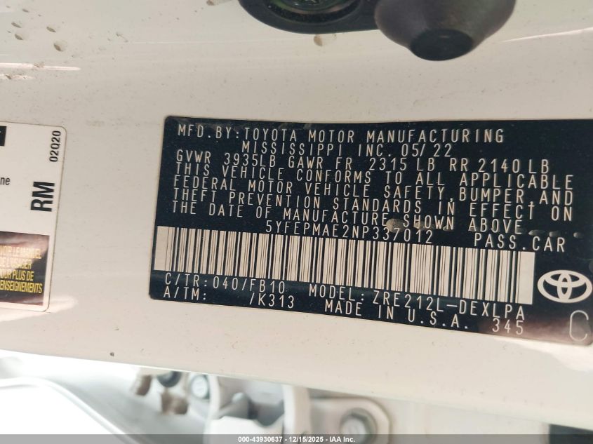2022 TOYOTA COROLLA - 5YFEPMAE2NP337012, колір - Білий, 1.8, Бензин, Передній привід із США