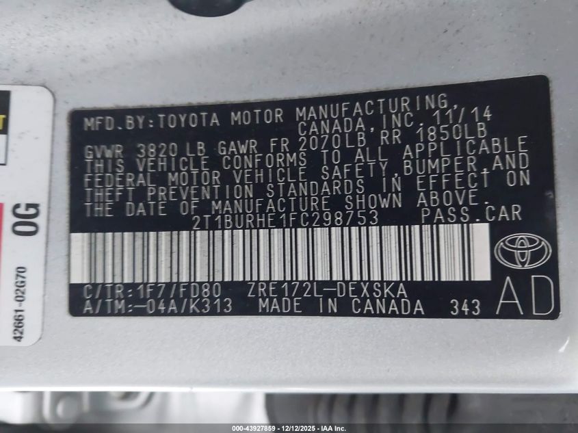 2015 TOYOTA COROLLA - 2T1BURHE1FC298753, колір - Срібний, 1.8, Бензин, Передній привід із США