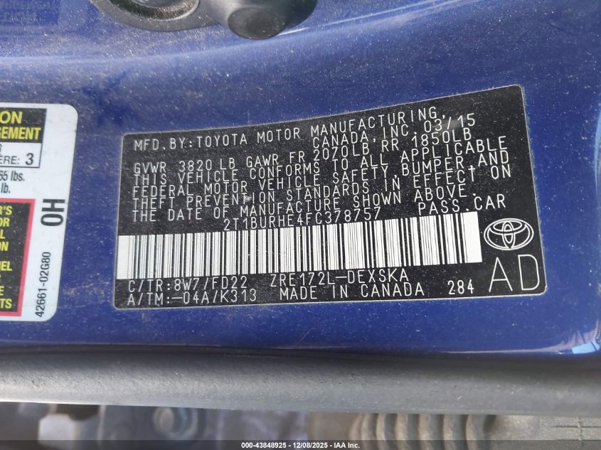 2015 TOYOTA COROLLA - 2T1BURHE4FC378757, колір - Синій, 1.8, Бензин, Передній привід із США