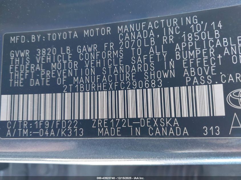 2015 TOYOTA COROLLA - 2T1BURHEXFC290683, колір - Сірий, 1.8, Бензин, Передній привід із США