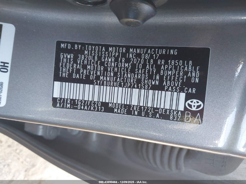 2018 TOYOTA COROLLA - 5YFBURHE1JP741587, колір - Сірий, 1.8, Бензин, Передній привід із США