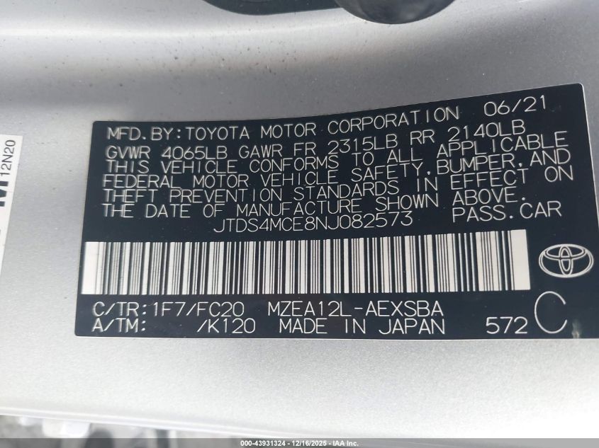 2022 TOYOTA COROLLA - JTDS4MCE8NJ082573, колір - , 2.0, Бензин, Передній привід із США