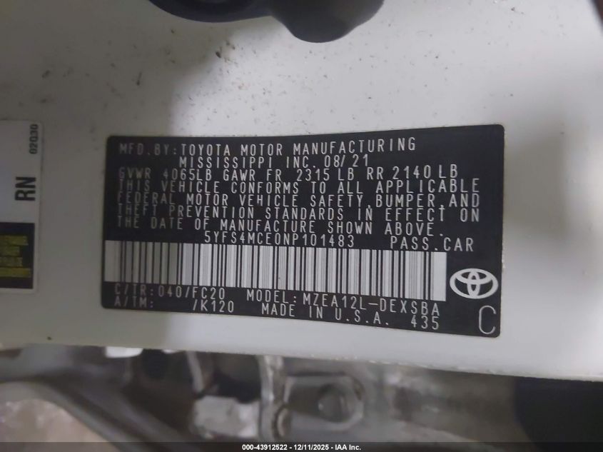 2022 TOYOTA COROLLA - 5YFS4MCE0NP101483, колір - Білий, 2.0, Бензин, Передній привід із США