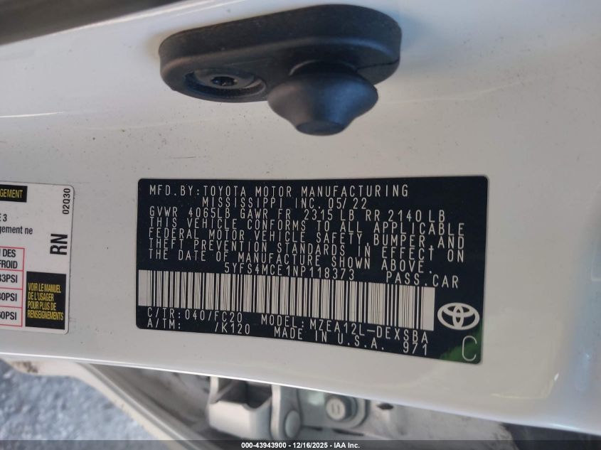 2022 TOYOTA COROLLA - 5YFS4MCE1NP118373, колір - , 2.0, Бензин, Передній привід із США