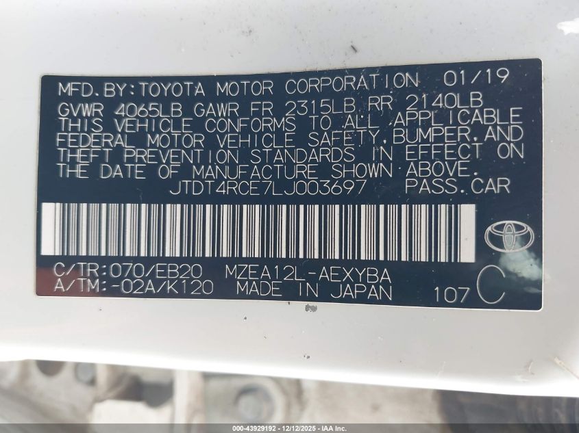 2020 TOYOTA COROLLA L