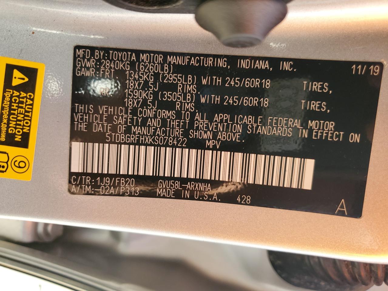 2019 TOYOTA HIGHLANDER - 5TDBGRFHXKS078422, колір - Срібний, 3.5, Гібрид, Повний привід із США