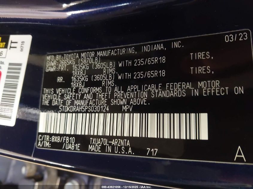 2023 TOYOTA HIGHLANDER - 5TDKDRAH5PS030124, колір - Синій, 2.4, Бензин, Передній привід із США