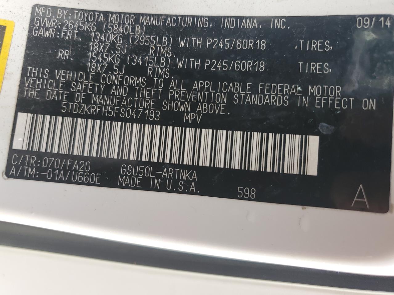 2015 TOYOTA HIGHLANDER - 5TDZKRFH5FS047193, колір - Білий, 3.5, Бензин, із США