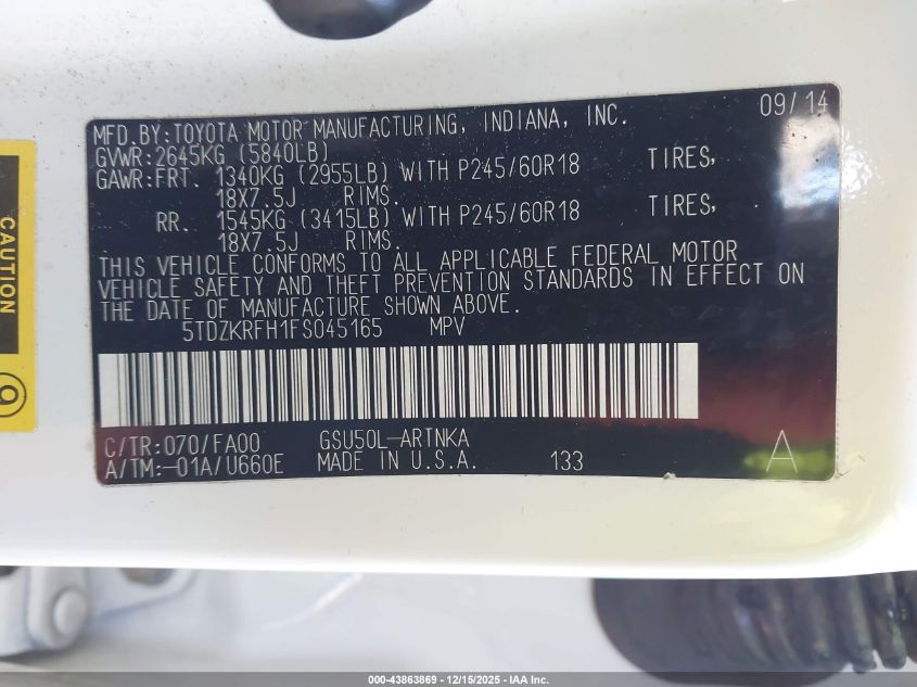 2015 TOYOTA HIGHLANDER - 5TDZKRFH1FS045165, колір - Білий, 3.5, Бензин, Передній привід із США