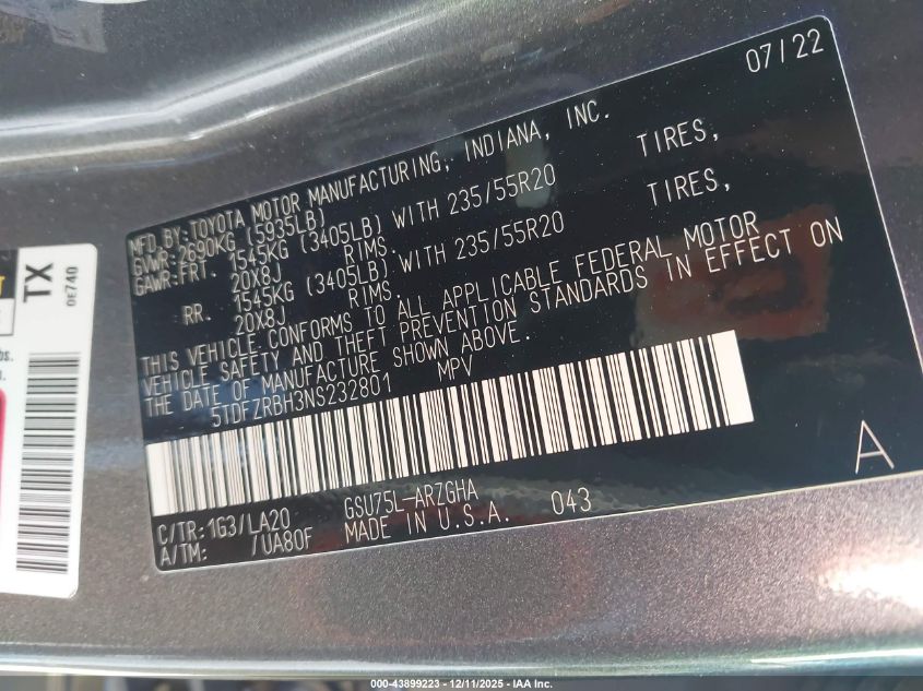 2022 TOYOTA HIGHLANDER - 5TDFZRBH3NS232801, колір - Сірий, 3.5, Бензин, Повний привід із США