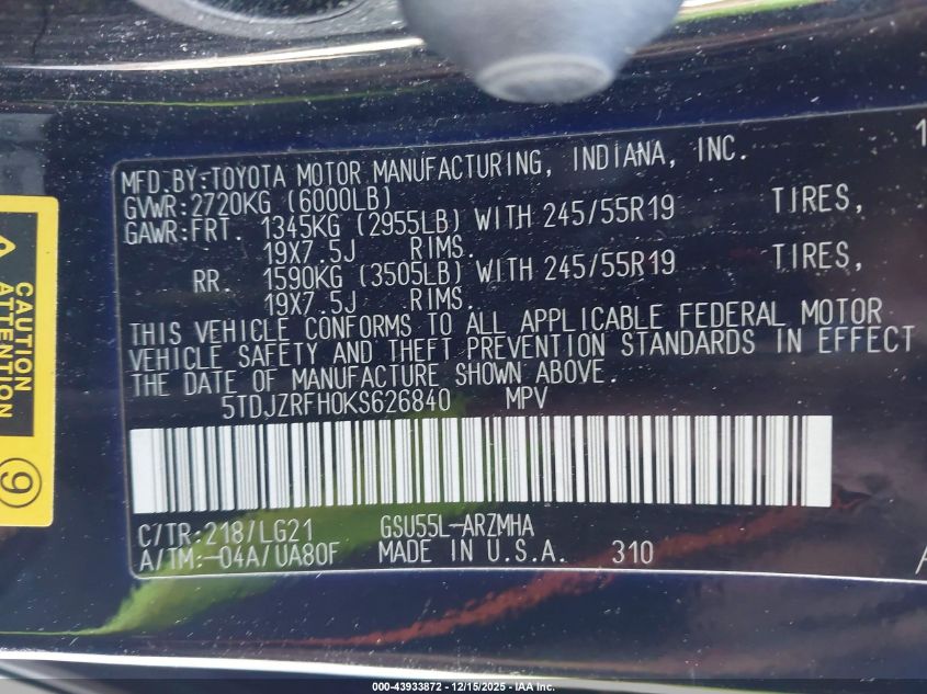 2019 TOYOTA HIGHLANDER - 5TDJZRFH0KS626840, колір - Чорний, 3.5, Бензин, Повний привід із США