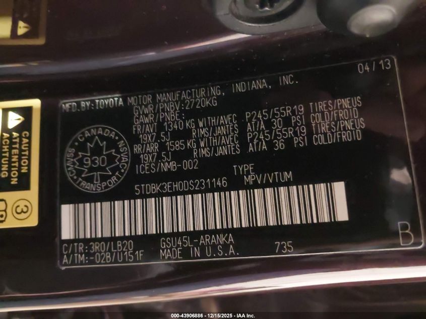 2013 TOYOTA HIGHLANDER - 5TDBK3EH0DS231146, колір - Фіолетовий, 3.5, Бензин, Повний привід із США