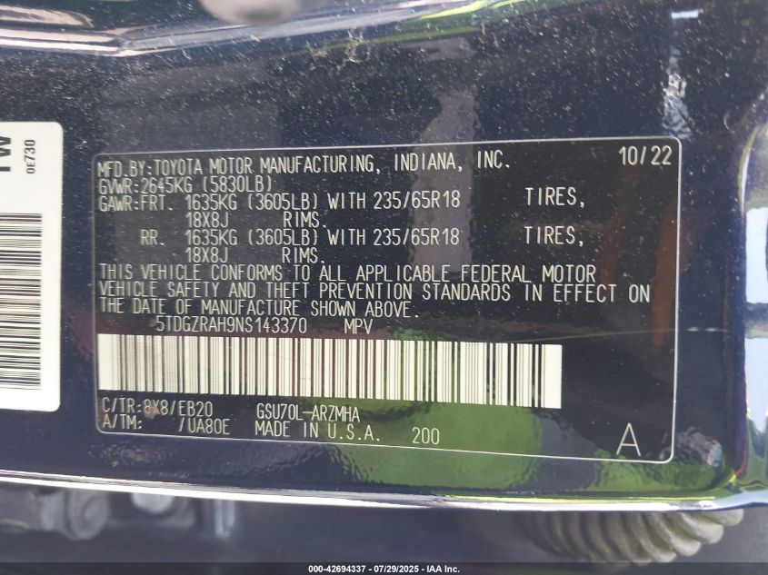 2022 TOYOTA HIGHLANDER - 5TDGZRAH9NS143370, колір - Синій, 3.5, Бензин, Передній привід із США