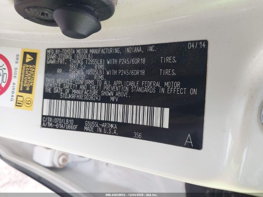 2014 TOYOTA HIGHLANDER - 5TDJKRFHXES038243, колір - Білий, 3.5, Бензин, Повний привід із США