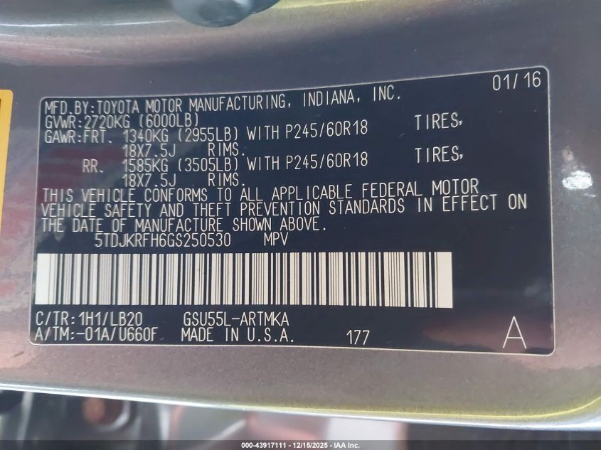 2016 TOYOTA HIGHLANDER - 5TDJKRFH6GS250530, колір - Сірий, 3.5, Бензин, Повний привід із США