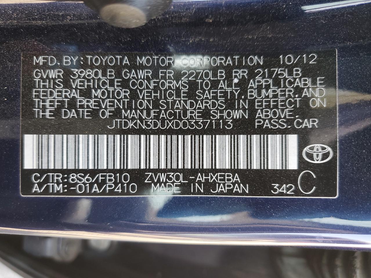 Колір СинійЦиліндри 4VIN JTDKN3DUXD0337113Стан НевідомоУшкодження Передня або задня