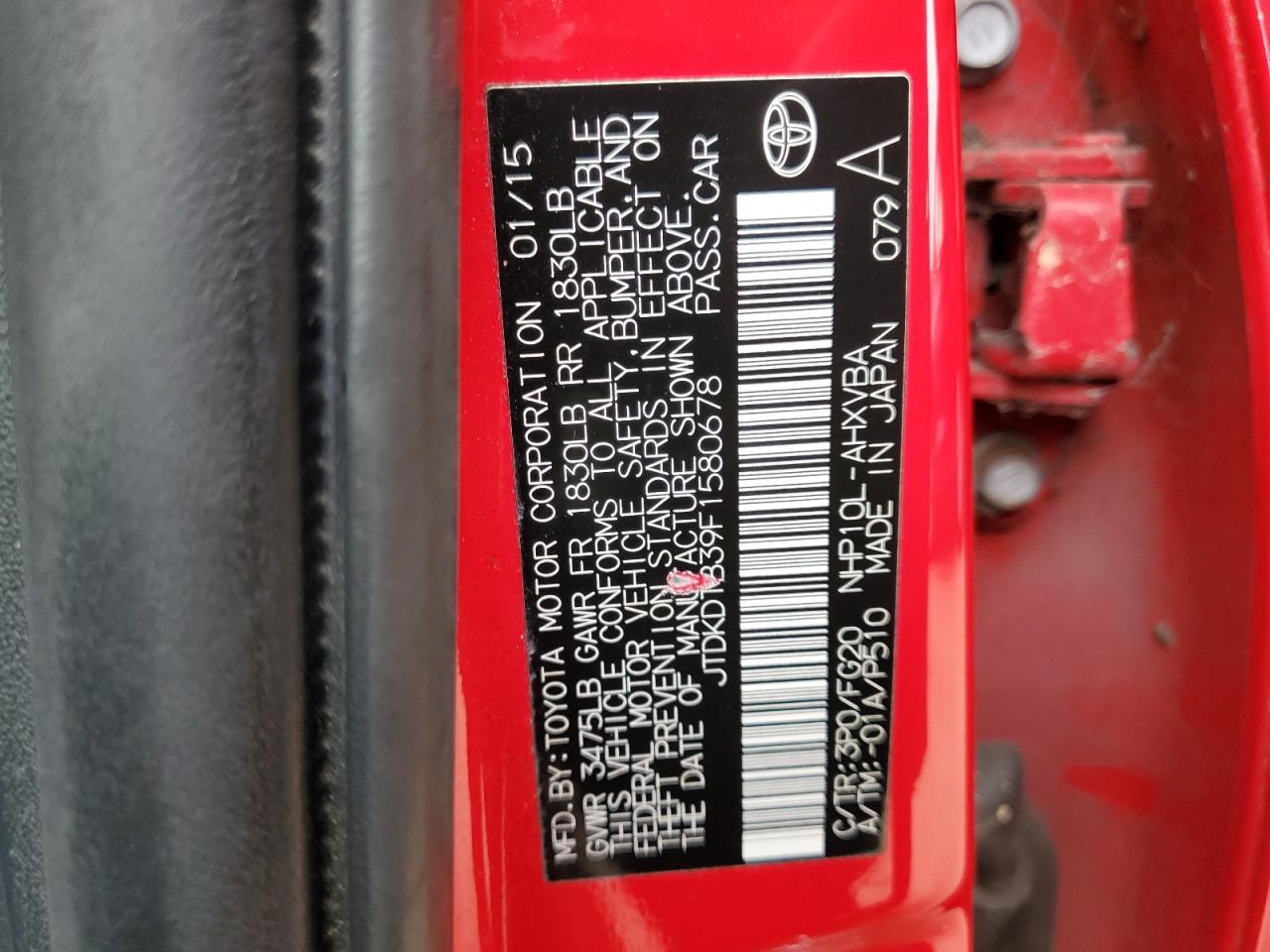 Колір ЧервонийЦиліндри 4VIN JTDKDTB39F1580678Стан НевідомоУшкодження Передня або задня