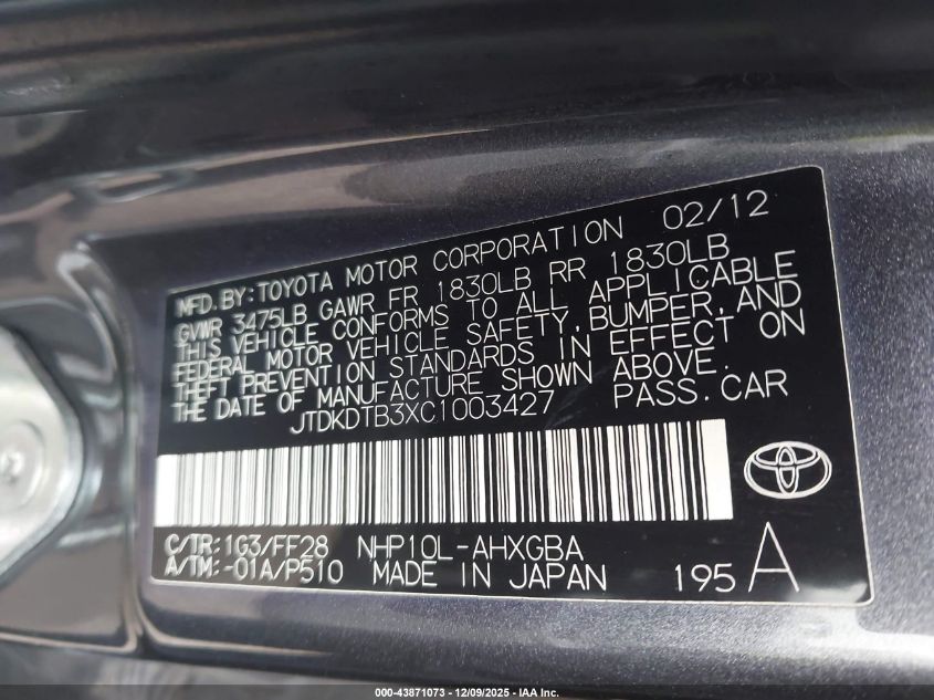 Колір СірийЦиліндри 4Привід Передній привідVIN JTDKDTB3XC1003427Стан ЗаводитьсяУшкодження Передня і задня