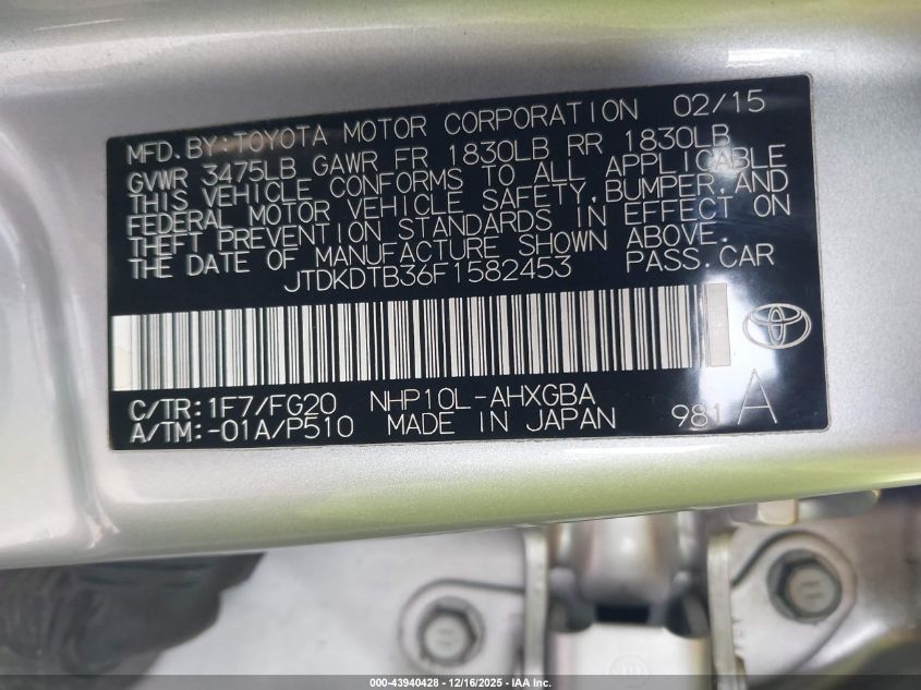 2015 TOYOTA PRIUS C - JTDKDTB36F1582453, колір - Срібний, 1.5, Гібрид, Передній привід із США