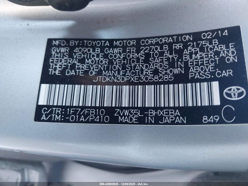 Колір СрібнийЦиліндри 4Привід Передній привідVIN JTDKN3DPXE3058285Стан Заводиться та їде (перевірено)Ушкодження Ліва сторона