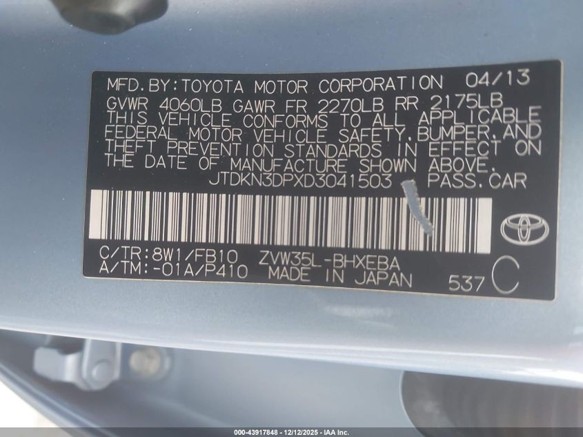 2013 TOYOTA PRIUS - JTDKN3DPXD3041503, колір - Синій, 1.8, Гібрид, Передній привід із США