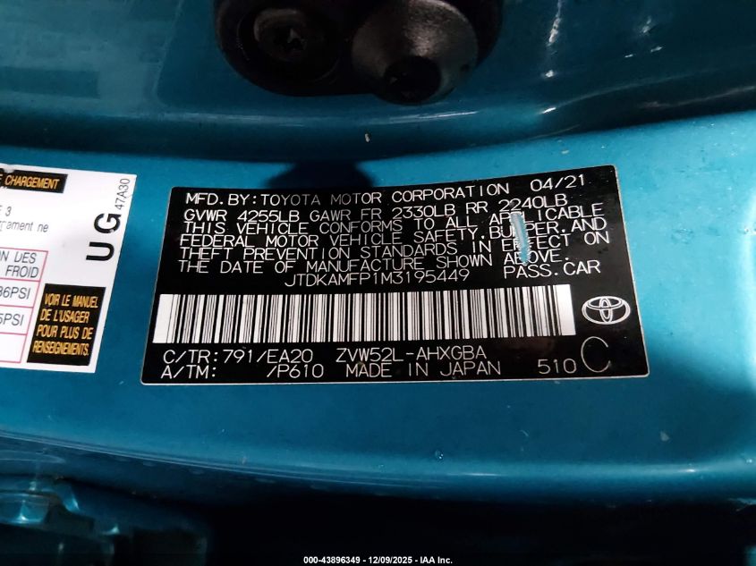 2021 TOYOTA PRIUS PRIME - JTDKAMFP1M3195449, колір - Синій, 1.8, Гібрид, Передній привід із США
