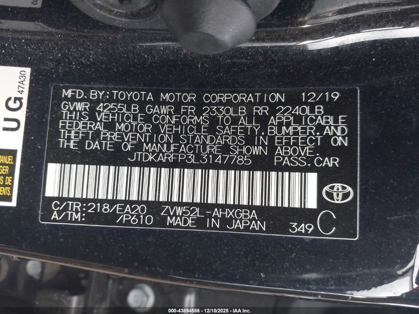 2020 TOYOTA PRIUS PRIME - JTDKARFP3L3147785, колір - Чорний, 1.8, Гібрид, Передній привід із США