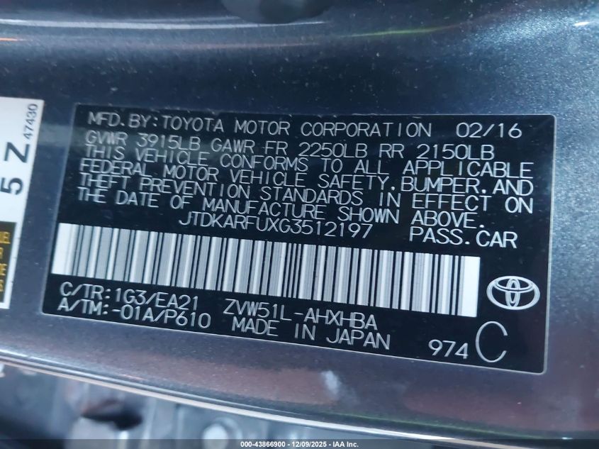 Колір СірийЦиліндри 4Привід Передній привідVIN JTDKARFUXG3512197Стан СтаціонарноУшкодження Передня або задня