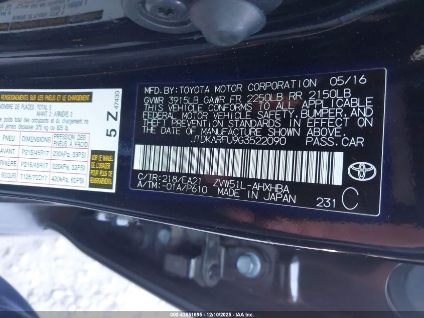 2016 TOYOTA PRIUS - JTDKARFU9G3522090, колір - Чорний, 1.8, Гібрид, Передній привід із США