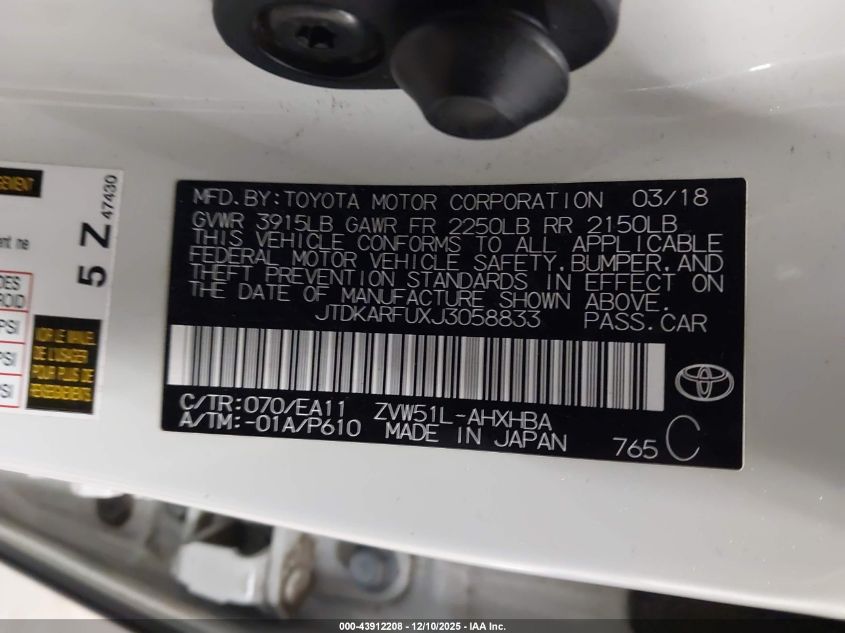 2018 TOYOTA PRIUS - JTDKARFUXJ3058833, колір - Білий, 1.8, Гібрид, Передній привід із США