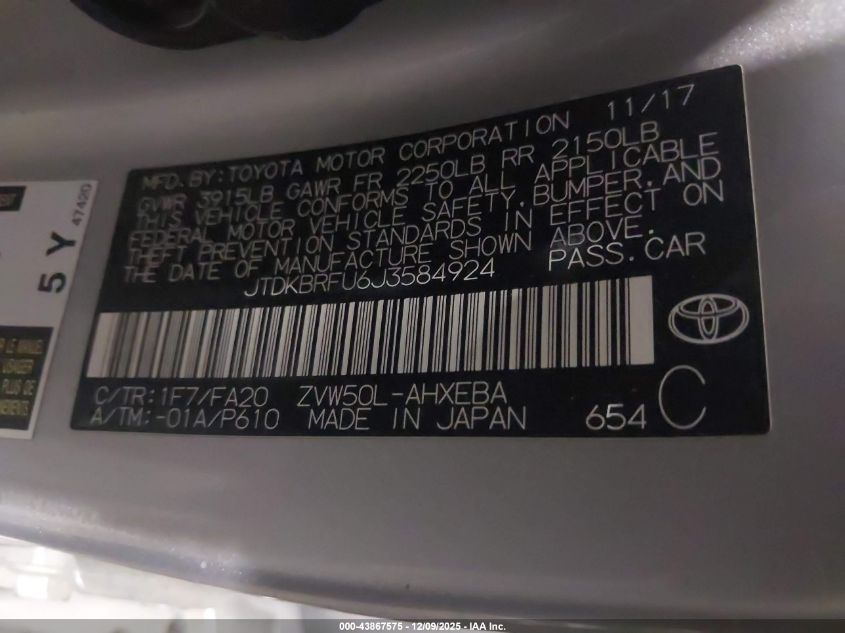 2018 TOYOTA PRIUS - JTDKBRFU6J3584924, колір - Срібний, 1.8, Гібрид, Передній привід із США