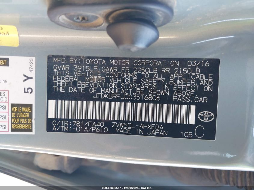 Колір СинійЦиліндри 4Привід Передній привідVIN JTDKBRFU0G3516806Стан Заводиться та їде (перевірено)Ушкодження Задня