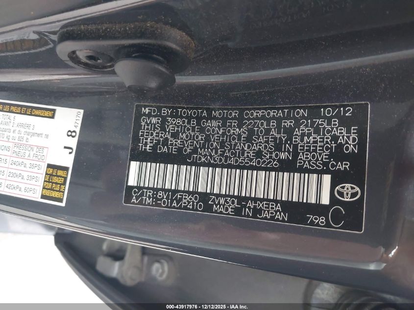 Колір СинійЦиліндри 4Привід Передній привідVIN JTDKN3DU4D5540226Стан Заводиться та їде (перевірено)Ушкодження Передня права