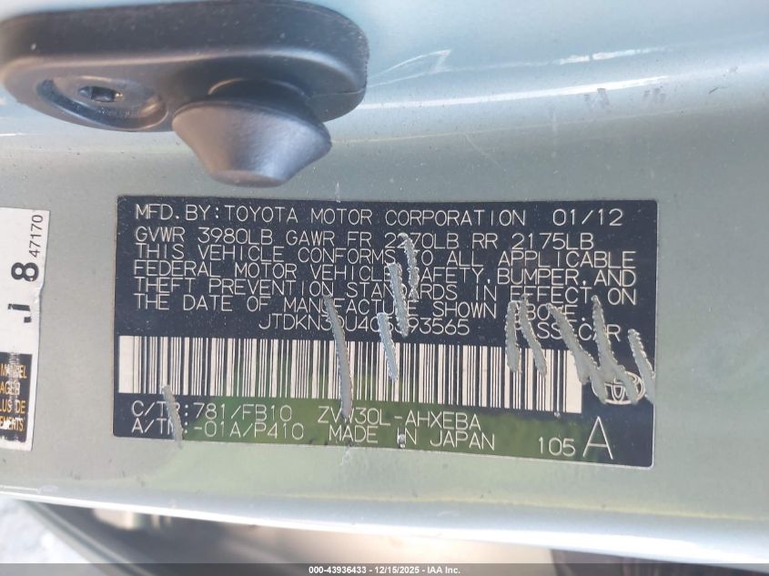 2012 TOYOTA PRIUS - JTDKN3DU4C5393565, колір - Зелений, 1.8, Гібрид, Передній привід із США