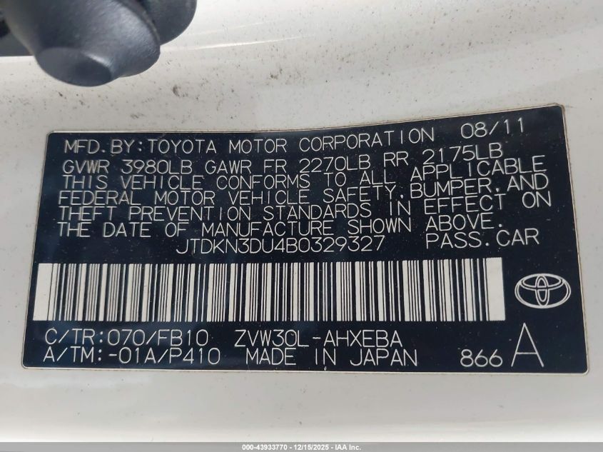 Колір БілийЦиліндри 4Привід Передній привідVIN JTDKN3DU4B0329327Стан СтаціонарноУшкодження Пожежа