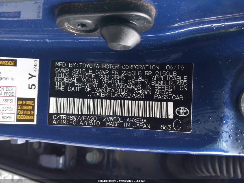 2016 TOYOTA PRIUS - JTDKBRFUXG3527960, колір - , 1.8, Гібрид, Передній привід із США