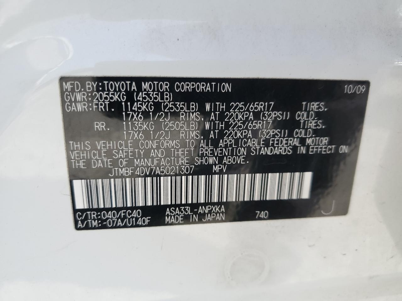 Колір БілийЦиліндри 4Привід Повний привідVIN JTMBF4DV7A5021307Стан ЗаводитьсяУшкодження Передня або задня