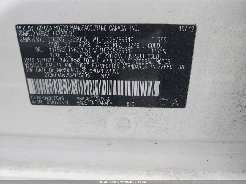 2012 TOYOTA RAV4 - 2T3KF4DV2CW145609, колір - Білий, 2.5, Бензин, Передній привід із США