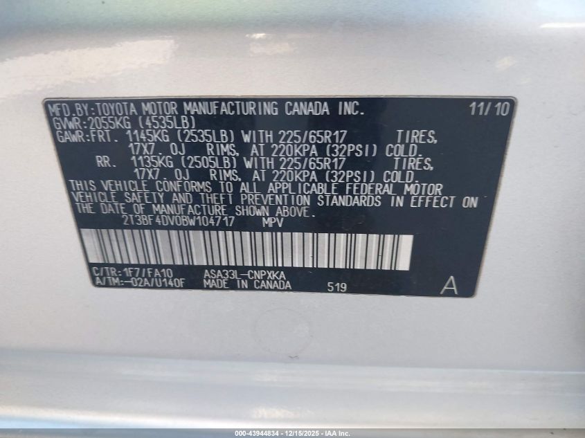 Колір СірийЦиліндри 4Привід Повний привідVIN 2T3BF4DV0BW104717Стан СтаціонарноУшкодження Задня права