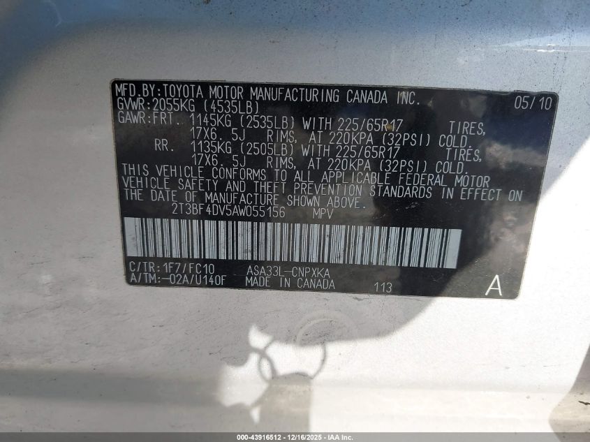 Колір СрібнийЦиліндри 4Привід Повний привідVIN 2T3BF4DV5AW055156Стан НевідомоУшкодження Невідомо